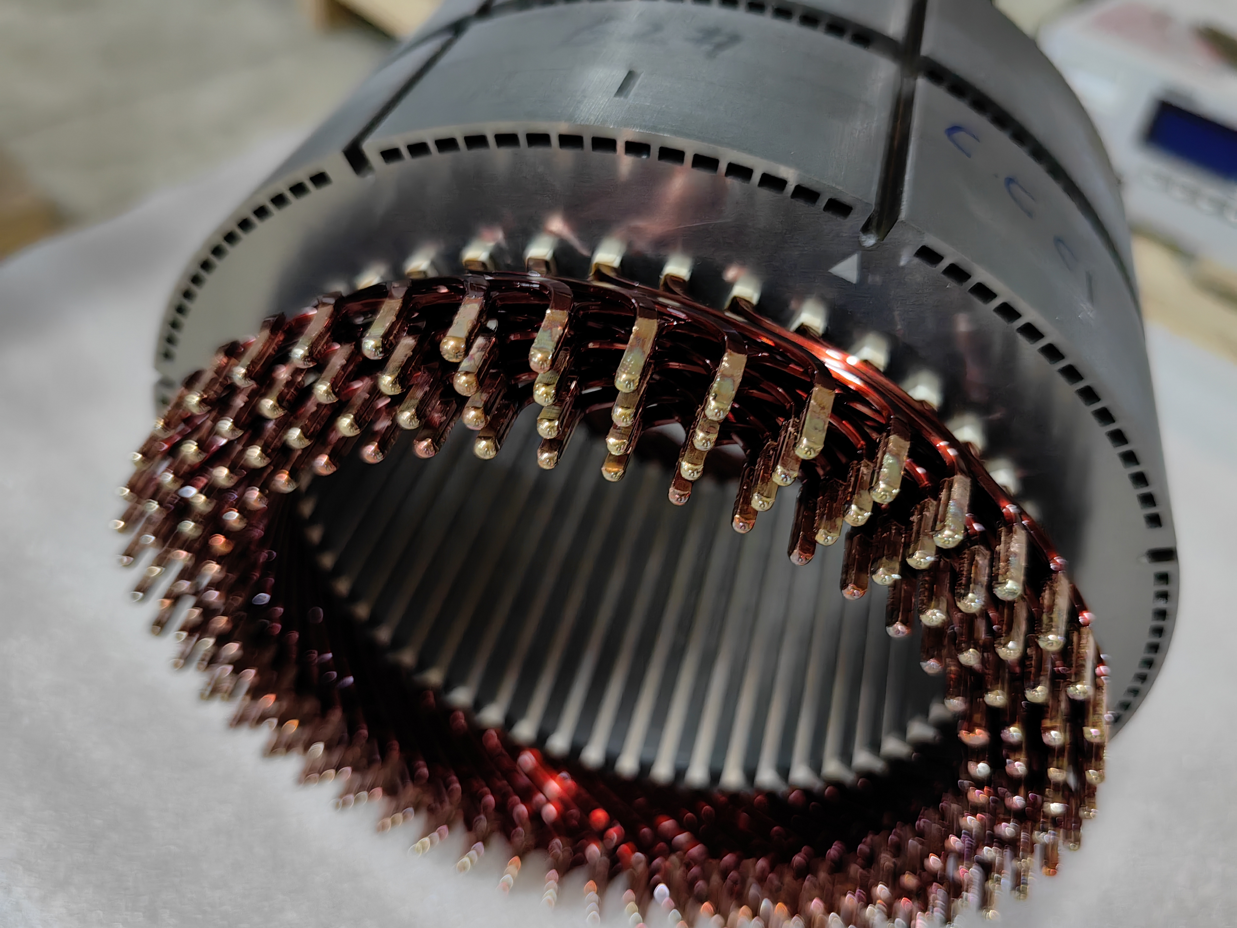 (1)鐵芯上絕緣紙(B形、S形、O型)→(2)漆包扁線下線去漆成U型→(3)異形線定長下線去漆→(4)異形線成型→(5)星點(diǎn)線焊接→(6)人工預(yù)插線入定子鐵芯→(7)線圈整形壓入鐵芯→(8)非出線端自動(dòng)伺服扭頭并自動(dòng)消除回彈角→(9)非出線端線頭自動(dòng)切平→(10)非出線端自動(dòng)TIG焊接→(11)三相引出線焊接。